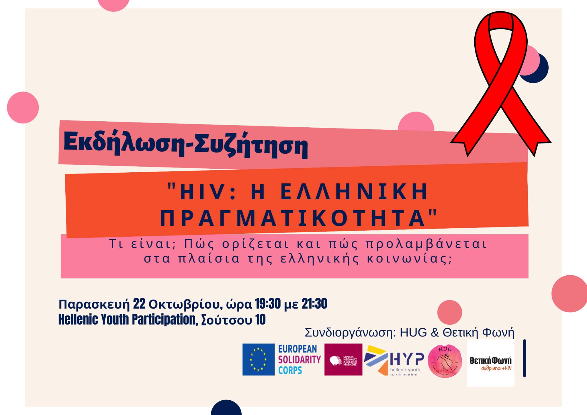 Η ομάδα της H.U.G. σε συνεργασία με την Θετική Φωνή (Positive Voice) σας προσκαλεί σε μια ακόμη εκδήλωση, με τίτλο «HIV: Η ελληνική πραγματικότητα». Τι είναι ο HIV; Πώς ορίζεται; Πώς προλαμβάνεται στα πλαίσια της ελληνικής κοινωνίας; Αυτά κι άλλα πολλά πρόκειται να συζητηθούν σε μια πολύ ενδιαφέρουσα συνάντηση! Θα γίνει μια σύντομη ιστορική αναδρομή του HIV/AIDS τόσο σε παγκόσμιο όσο και σε ελληνικό επίπεδο, θα ορίσουμε τι είναι ο HIV και τι το AIDS, θα μιλήσουμε για τους τρόπους μετάδοσης και μη, καθώς και ποια εργαλεία πρόληψης υπάρχουν κατά του HIV. Επίσης, θα γίνει μια συνοπτική αναφορά για τα Σεξουαλικώς Μεταδιδόμενα Νοσήματα - ποια είναι και τι βασικά χαρακτηριστικά έχουν - και τέλος, θα γίνει μια συζήτηση για το πώς είναι να ζεις με τον HIV στην Ελλάδα του 2021. Λίγα λόγια για την Θετική Φωνή (Positive Voice): Ο Σύλλογος Οροθετικών Ελλάδας «Θετική Φωνή» ιδρύθηκε το 2009 με σκοπό την καταπολέμηση της εξάπλωσης του HIV, καθώς και τον περιορισμό των κοινωνικών και οικονομικών επιπτώσεων στην Ελλάδα. Για την επίτευξη του σκοπού του, ο σύλλογος θα αγωνισθεί για την εξασφάλιση καλύτερων πρακτικών πρόληψης και ενημέρωσης, υπηρεσιών περίθαλψης και κοινωνικής μέριμνας των οροθετικών και ευάλωτων στον HIV κοινωνικών ομάδων. Θα εργαστεί επίσης για την κοινωνική αποδοχή, αλληλεγγύη και υποστήριξη των ομάδων αυτών, ώστε να αντιμετωπιστούν οι παραβιάσεις της αξιοπρέπειας και των ανθρωπίνων δικαιωμάτων τους. (περισσότερα στο http://www.positivevoice.gr/) Εκδήλωση από Hellenic Youth Participation, H.U.G - Healthy and Unique we Grow και Θετική Φωνή (Positive Voice)