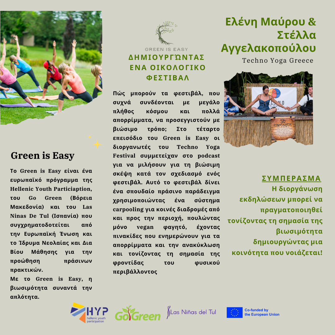 Πώς μπορούν τα φεστιβάλ, που συχνά συνδέονται με μεγάλο πλήθος κόσμου και πολλά απορρίμματα, να προσεγγιστούν με βιώσιμο τρόπο; Στο τέταρτο επεισόδιο του Green is Easy οι διοργανωτές του Techno Yoga Festival συμμετείχαν στο podcast για να μιλήσουν για τη βιώσιμη σκέψη κατά τον σχεδιασμό ενός φεστιβάλ. Αυτό το φεστιβάλ δίνει ένα σπουδαίο πράσινο παράδειγμα χρησιμοποιώντας ένα σύστημα carpool για κοινές διαδρομές από και προς την περιοχή, πουλώντας μόνο vegan φαγητό, έχοντας πινακίδες που ενημερώνουν για τα απορρίμματα και την ανακύκλωση και τονίζοντας τη σημασία της φροντίδας του φυσικού περιβάλλοντος. Μάθαμε ότι η εφαρμογή πράσινων πρακτικών απαιτεί μερικές φορές χρόνο και προγραμματισμό, ωστόσο, είναι απολύτως εφικτή. Το πιο σημαντικό είναι ότι, όταν οι διοργανωτές εκδηλώσεων τονίζουν τη σημασία της βιωσιμότητας, έχουν τη δύναμη να δημιουργήσουν μια κοινότητα που νοιάζεται!