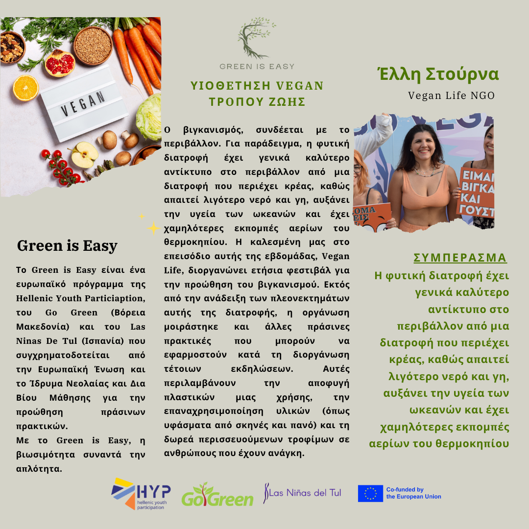 Στο πέμπτο επεισόδιο του Green is Easy, μάθαμε περισσότερα για το πώς ο βιγκανισμός, που συχνά θεωρείται μόνο ως δίαιτα, συνδέεται επίσης με το περιβάλλον. Για παράδειγμα, η φυτική διατροφή έχει γενικά καλύτερο αντίκτυπο στο περιβάλλον από μια διατροφή που περιέχει κρέας, καθώς απαιτεί λιγότερο νερό και γη, αυξάνει την υγεία των ωκεανών και έχει χαμηλότερες εκπομπές αερίων του θερμοκηπίου. Η καλεσμένη μας στο επεισόδιο αυτής της εβδομάδας, η Vegan Life, διοργανώνει ετήσια φεστιβάλ για την προώθηση του βιγκανισμού. Εκτός από την ανάδειξη των πλεονεκτημάτων αυτής της διατροφής, η οργάνωση μοιράστηκε και άλλες πράσινες πρακτικές που μπορούν να εφαρμοστούν κατά τη διοργάνωση τέτοιων εκδηλώσεων. Αυτές περιλαμβάνουν την αποφυγή πλαστικών μιας χρήσης, την επαναχρησιμοποίηση υλικών (όπως υφάσματα από σκηνές και πανό) και τη δωρεά περισσευούμενων τροφίμων σε ανθρώπους που έχουν ανάγκη. Τέτοιες πρακτικές μπορούν να ενσωματωθούν μέσω της συνεργασίας μεταξύ οργανισμών και εταιρειών που προσφέρουν βιώσιμες λύσεις, ώστε να διασφαλιστεί ότι η βιωσιμότητα προσεγγίζεται από όλες τις πλευρές.