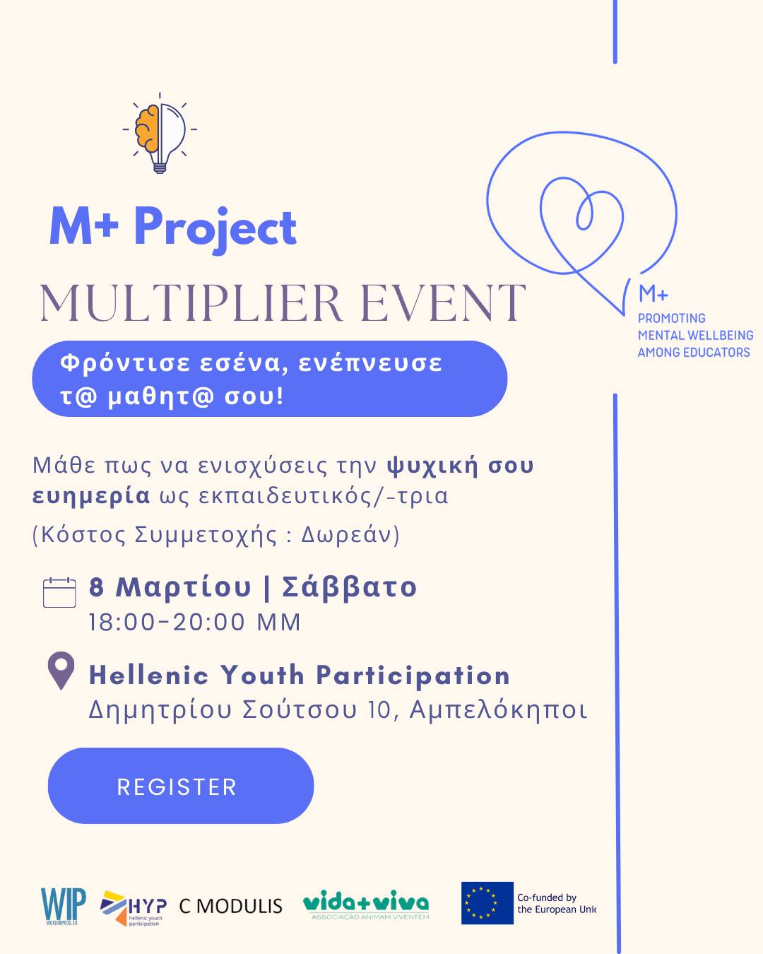 Το Μ+ Project χρηματοδοτείται από την Ευρωπαϊκή Ένωση και συνεχίζει να στηρίζει δράσεις που προάγουν την ψυχική ευημερία και την επαγγελματική ανάπτυξη στον εκπαιδευτικό χώρο.