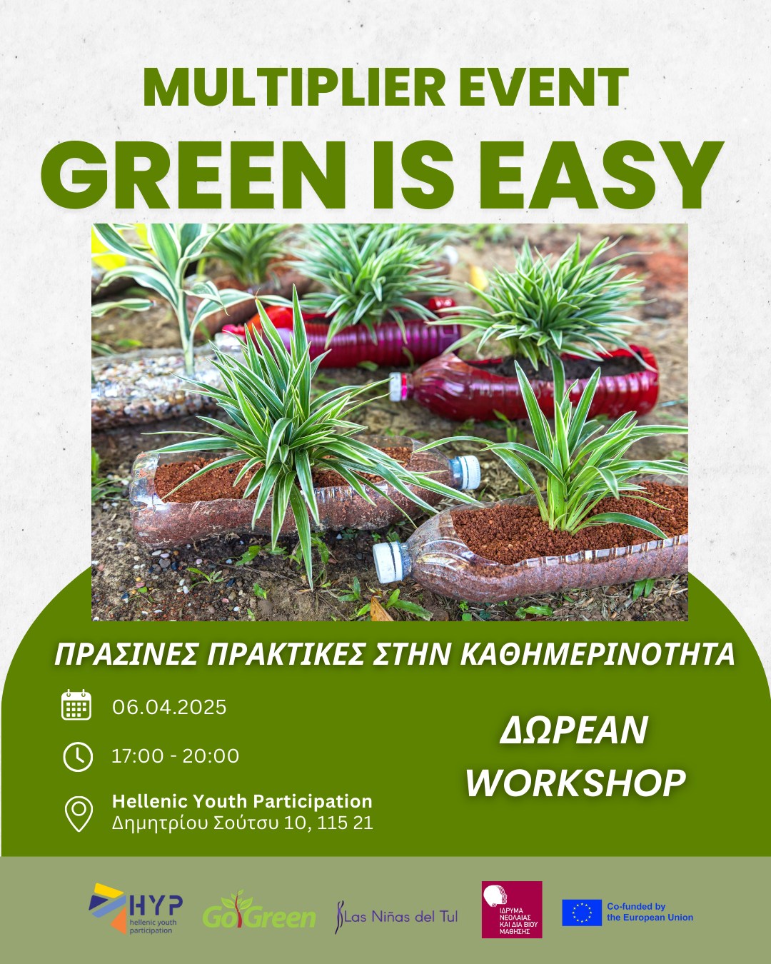 Το Green is Easy Multiplier Event πραγματοποιήθηκε, με στόχο να φέρει πιο φιλικές προς το περιβάλλον πρακτικές στην καθημερινή μας ζωή. Οι συμμετέχοντες είχαν την ευκαιρία να γνωρίσουν το project και να ανακαλύψουν τρόπους να μειώσουν το οικολογικό τους αποτύπωμα μέσα από διαδραστικά και πρακτικά εργαστήρια.