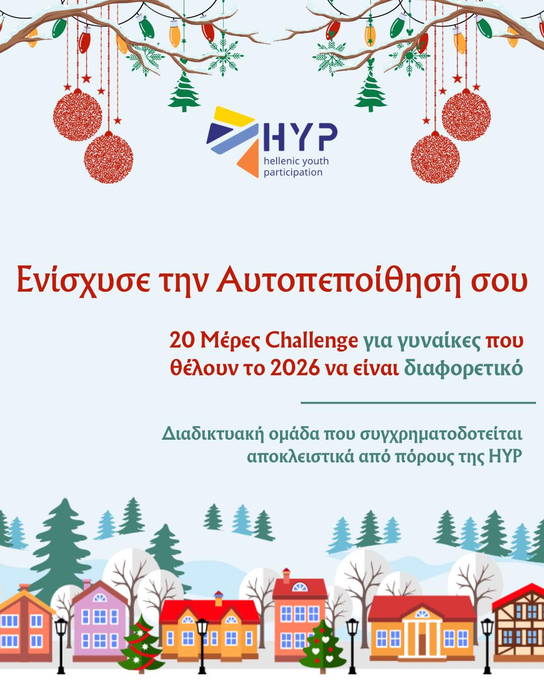 Η Hellenic Youth Participation, σε συνεργασία με τον @o_gynaikonitis και την Ελένη, υλοποίησε το 2ο Διαδικτυακό 20ήμερο Challenge Αυτοπεποίθησης για Γυναίκες, ένα πρόγραμμα αφιερωμένο στην προσωπική και επαγγελματική ενδυνάμωση.
