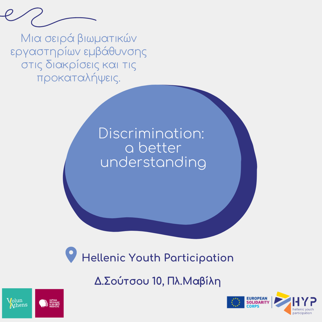 Σας αρέσει να μοιράζεστε απόψεις και να είστε μέλος μιας πολυπολιτισμικής ομάδας; Σας αρέσουν οι αστείες και στοχαστικές δραστηριότητες; Θέλετε να βελτιώσετε το επίπεδο των αγγλικών σας; Είστε περισσότερο από ευπρόσδεκτοι τότε! Οι εθελοντές της Ελληνικής Συμμετοχής Νέων και του Ευρωπαϊκού Σώματος Αλληλεγγύης σας προσκαλούν σε μια σειρά από διάφορα εργαστήρια σχετικά με τις διακρίσεις. Εκεί, ο στόχος είναι να κατανοήσουμε καλύτερα αυτό το θέμα, ενώ παράλληλα εμβαθύνουμε στην ιδέα μαζί χάρη σε διάφορες δραστηριότητες και μέσα όπως συζητήσεις, παιχνίδια ρόλων, άρθρα, ακόμη και μελέτες ταινιών μικρού μήκους https://www.facebook.com/events/1184286785547373?locale=el_GR