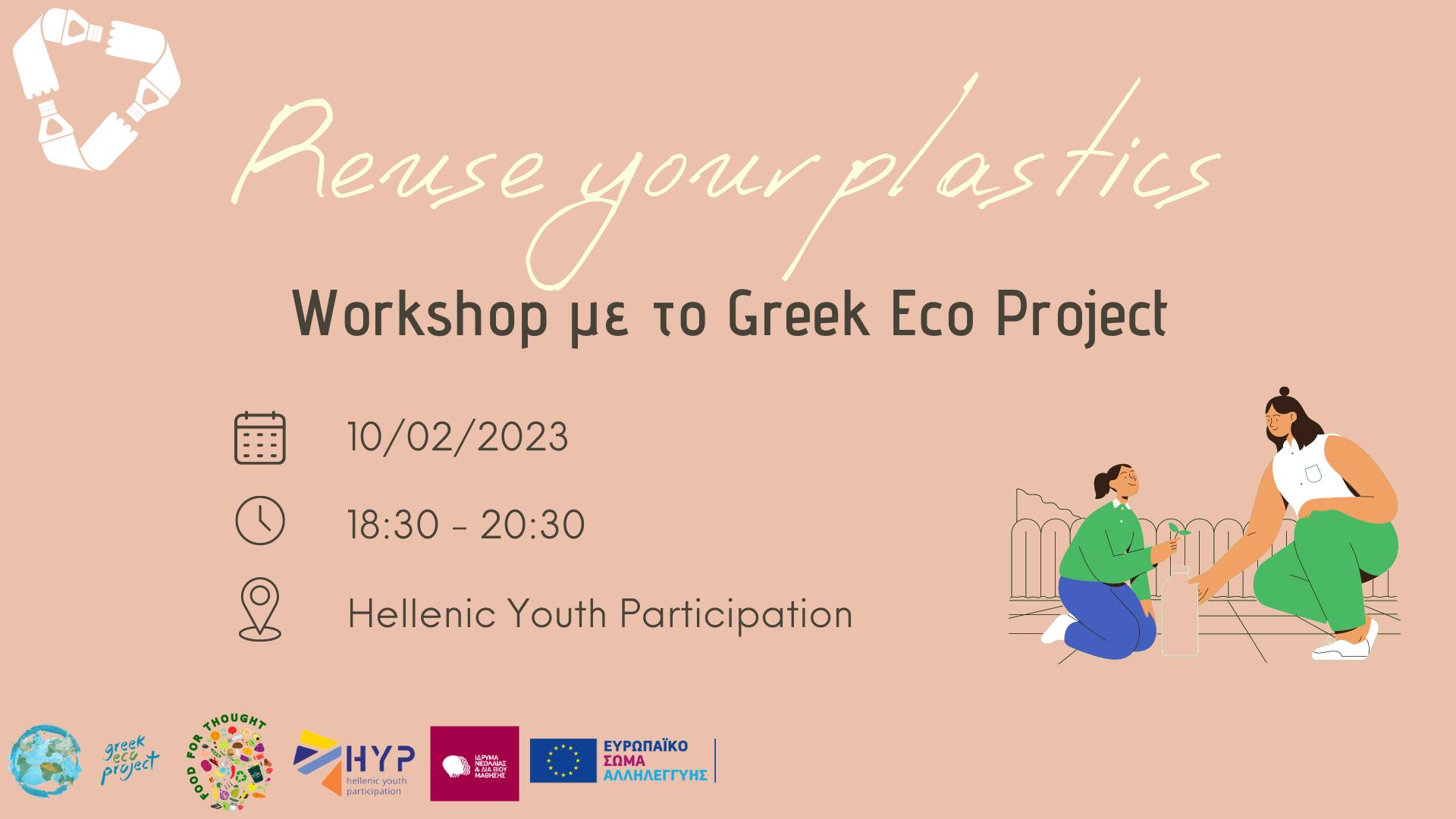 Παραγγέλνεις απ’ έξω και καταλήγεις με ένα σωρό συσκευασίες για ανακύκλωση; Τα φρούτα, λαχανικά και φαγητά που αγοράζεις σου αφήνουν άπειρες συσκευασίες που μετά πετάς; Μην τις πετάξεις! Κράτησέ τες και έλα στο διαδραστικό workshop Reuse your plastics για να εξερευνήσουμε με τη βοήθεια του Greek Eco Project πως οι πλαστικές συσκευασίες μας μπορούν να επαναχρησιμοποιηθούν ώστε να γίνουν κάτι όμορφο. Η πρωτοβουλία νέων "Food for Thought" συγχρηματοδοτείται από το European Solidarity Corps της Ευρωπαϊκής Ένωσης και το Ίδρυμα Νεολαίας και Δια Βίου Μάθησης. Εκδήλωση από Hellenic Youth Participation, Greek Eco Project και Food for Thought