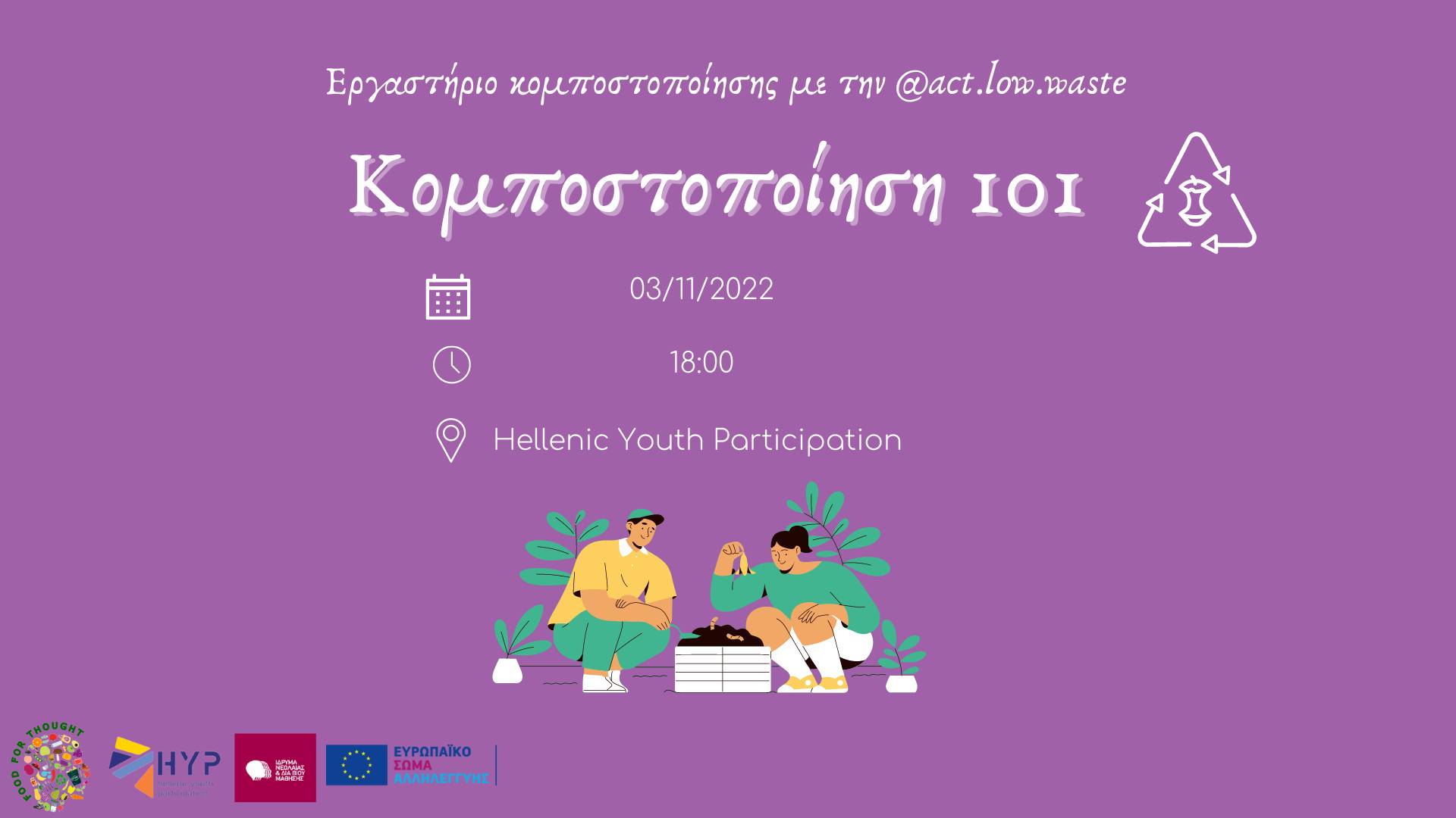 Τι είναι η κομποστοποίηση; Μπορείς να την κάνεις σπίτι σου κι ας μένεις σε διαμέρισμα; Ποια είναι τα do's and dont's; Έλα να εξερευνήσουμε μαζί τον κόσμο της οικιακής κομποστοποίησης στην εκδήλωση μας "κομποστοποίηση 101". Ένα διαδραστικό workshop με την Αναστασία Σκόπα aka @act.low.waste όπου θα μάθουμε μαζί τη σημασία της κομποστοποίησης και πως αυτή μπορεί να μας βοηθήσει να μειώσουμε τα οικιακά μας απορρίμματα! Η πρωτοβουλία νέων "Food for Thought" συγχρηματοδοτείται από το European Solidarity Corps της Ευρωπαϊκής Ένωσης και το Ίδρυμα Νεολαίας και Δια Βίου Μάθησης. Περισσότερες πληροφορίες https://www.facebook.com/events/847790239912037