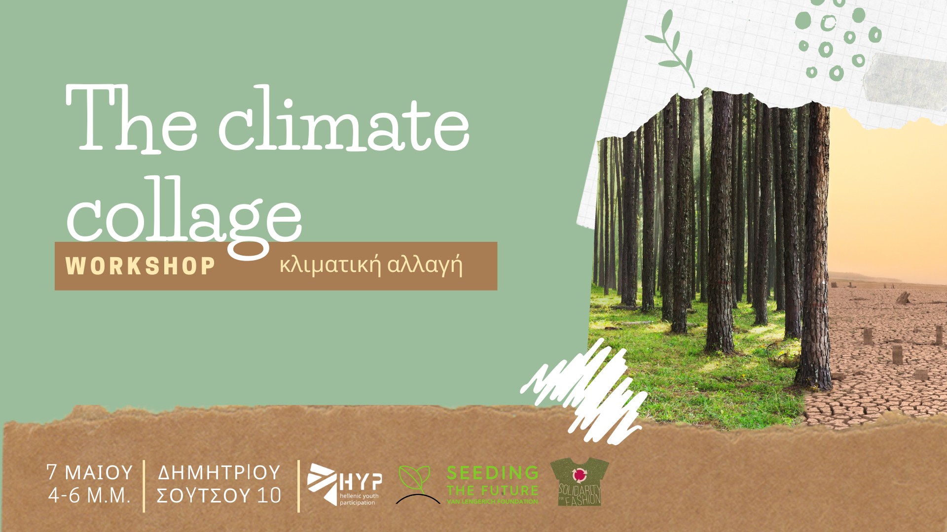 Στο εργαστήριο οι συμμετέχοντες μέσω της βιωματικής μάθησης θα ενημερωθούν με διασκεδαστικους τρόπους για τα αίτια και τις συνέπειες της κλιματικής αλλαγής, ενώ παράλληλα θα εργαστούν σε ομάδες. Αν η καταστροφή του πλανήτη είναι κάτι που σε προβληματίζει και κυρίως έαν ψάχνεις τρόπους να μάθεις ακόμα περισσότερα για τις απειλές που αντιμετωπίζει καθημερινά η γη, συμπλήρωσε την παρακάτω φόρμα. Το workshop θα πραγματοποιηθεί από την ομάδα Seeding for future. Τα μέλη τις ομάδας αποτελούνται από 7 οικολόγους, την Lisa, την Eloise, τον Arthur, την Sophia, την Laurelen, τον Ronan και τον Rémi. Η ομάδα περιοδεύει στην Ευρώπη με στόχο την ευαισθητοποίηση όσο περισσότερων ανθρώπων σε σχέση με την καταστροφή του περιβάλλοντος. Το έργο τους είναι βιωματικό και μέσα από τα εργαστήρια τους θέλουν να αναπτύξουν έναν συλλογικό προβληματισμό και να παρουσιάσουν τις οικολογικές πρωτοβουλίες που συμβαίνουν στην Ευρώπη. Όνειρο τους είναι να εμπνεύσουν τους συμμετέχοντες τόσο ώστε οι ίδιοι να αποκτήσουν ιδέες για έναν πιο οικολογικά βιώσιμο κόσμο. Εκδήλωση από τους Hellenic Youth Participation και Solidarity for Fashion Περισσότερα στον σύνδεσμο https://www.facebook.com/events/405989444417154
