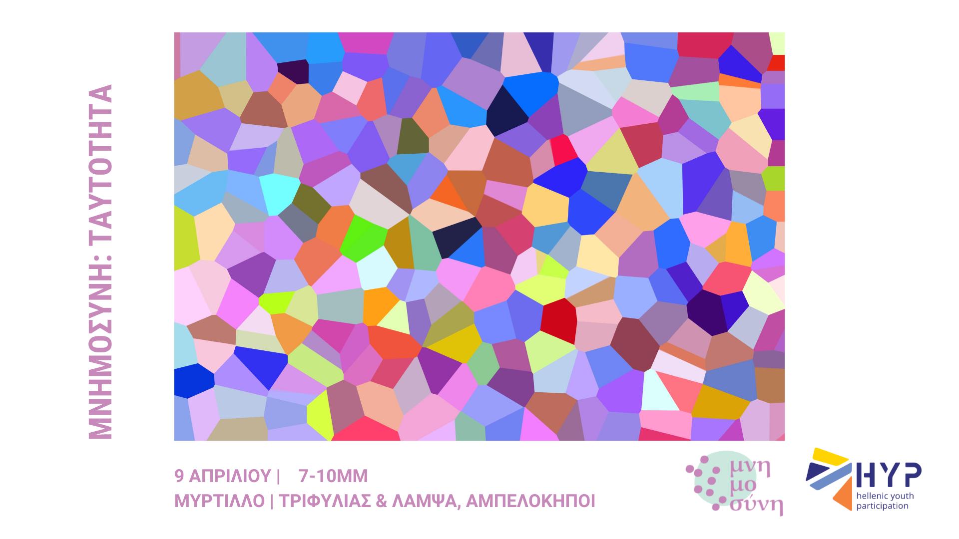 Η ομάδα της Μνημοσύνης ετοιμάζει την νέα της έκθεσης, μετά από 2 χρόνια αναμονής, με θέμα την ταυτότητα. Ποι@ είμαι σήμερα; Πώς άλλαξα μετά από μία πανδημία; Πώς βλέπω τις πλευρές μου μέσα από αυτές τις αλλαγές; Το Σάββατο 9 Απριλίου 2022 7-10μμ σας περιμένουμε για να το ανακαλύψουμε μαζί στον Πολυχώρο Μύρτιλλο (Τριφυλίας & Λάμψα, Αμπελόκηποι). Η Μνημοσύνη είναι η ομάδα τέχνης της Hellenic Youth Participation που από το 2015 έχει υλοποιήσει 8 εκθέσεις με θέμα την ταυτότητα, την γλώσσα, την χαρτογράφηση, την σεξουαλικότητα και την μεταμόρφωση με περισσότερα από 130 μέλη. Το 2021 υλοποιήσαμε την έκθεσή μας διαδικτυακά https://bit.ly/Stigmes_2021 και φέτος ανυπομονούμε να βρεθούμε ξανά από κοντά. Περισσότερα στο link: https://www.facebook.com/events/311547444250631
