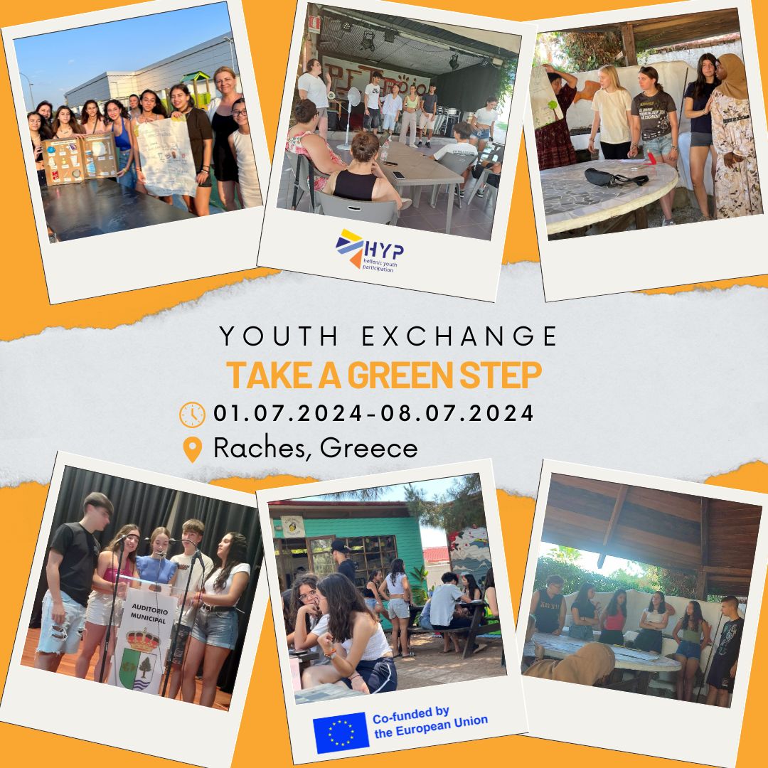 Το Take a Green Step είναι μια ανταλλαγή νέων που πραγματοποιήθηκε στις Ράχες από την 1η έως τις 8 Ιουλίου 2024. Στόχος του προγράμματος είναι η καταπολέμηση της περιβαλλοντικής κρίσης, η υλοποίηση δραστηριοτήτων σχετικών με το περιβάλλον μέσω της διαπολιτισμικής ομαδικής εργασίας και συνεργασίας και η ενεργοποίηση των εφήβων με την ανάληψη πρωτοβουλιών για την προστασία του περιβάλλοντος.