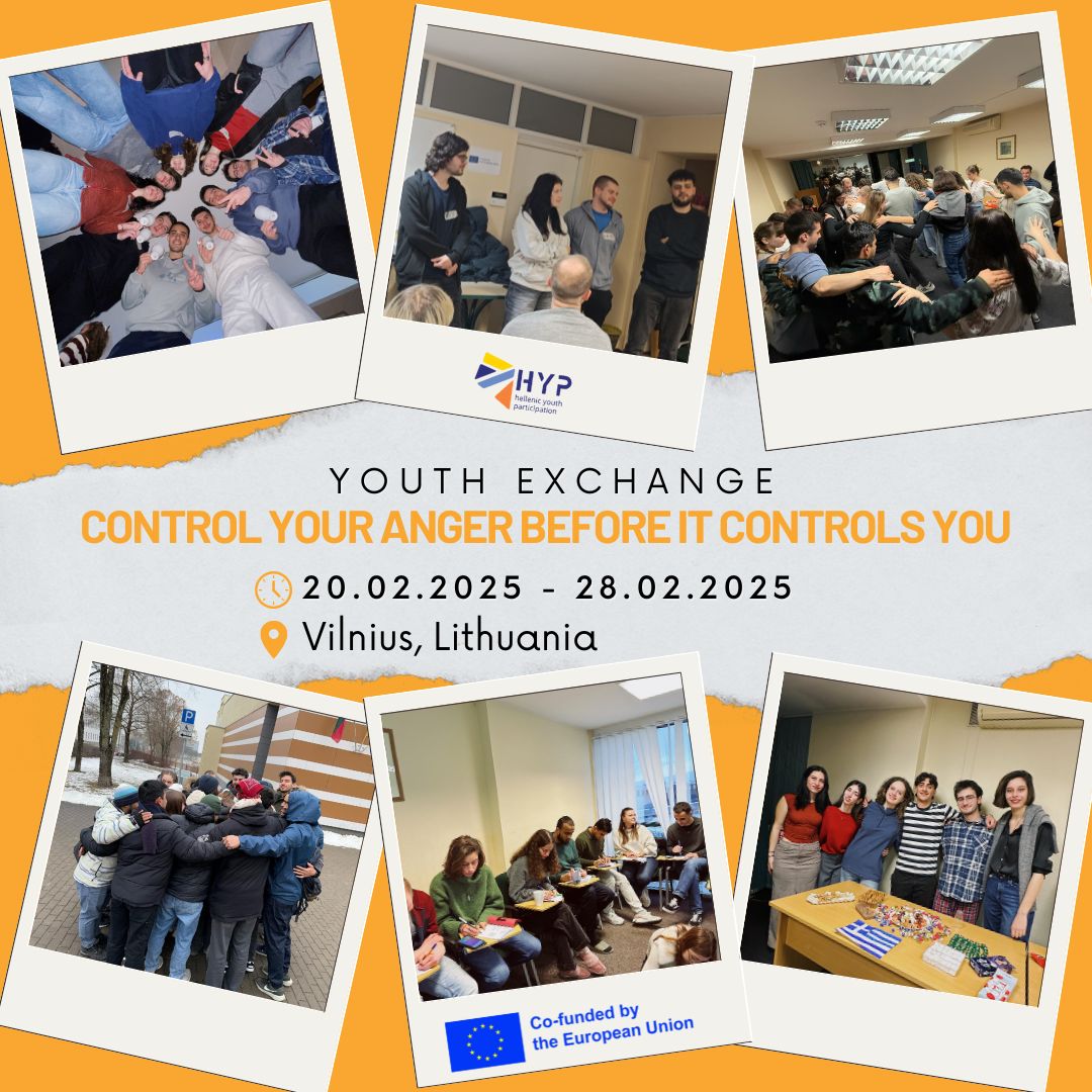 Control Your Anger Before It Controls You είναι το όνομα της ανταλλαγής νέων που πραγματοποιήθηκε στο Βίλνιους της Λιθουανίας, μεταξύ 20 και 28 Φεβρουαρίου 2025. Στην ανταλλαγή συμμετείχαν 6 άτομα και 1 αρχηγός ομάδας άνω των 18 ετών. Οι συμμετέχοντες είχαν την ευκαιρία να ασχοληθούν με το θέμα της συναισθηματικής νοημοσύνης, της ενσυνειδητότητας και της αυτοφροντίδας για την προαγωγή της ψυχικής υγείας.