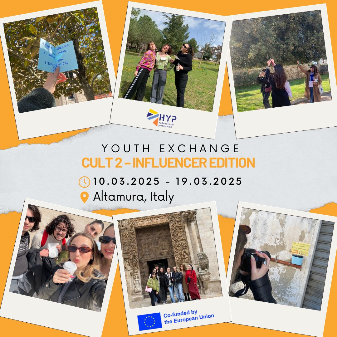 Το πρόγραμμα ανταλλαγής νέων «Cult 2 - Influencer Edition» στην όμορφη πόλη Altamura της Ιταλίας έφτασε στο τέλος του. Από τις 10 έως τις 19 Μαρτίου, οι συμμετέχοντες είχαν τη δυνατότητα να εξερευνήσουν καινοτόμους τρόπους προώθησης της λογοτεχνίας μεταξύ των νέων. Στην ανταλλαγή συμμετείχαν έξι συμμετέχοντες ηλικίας 18-25 ετών και ένας αρχηγός ομάδας άνω των 18 ετών.